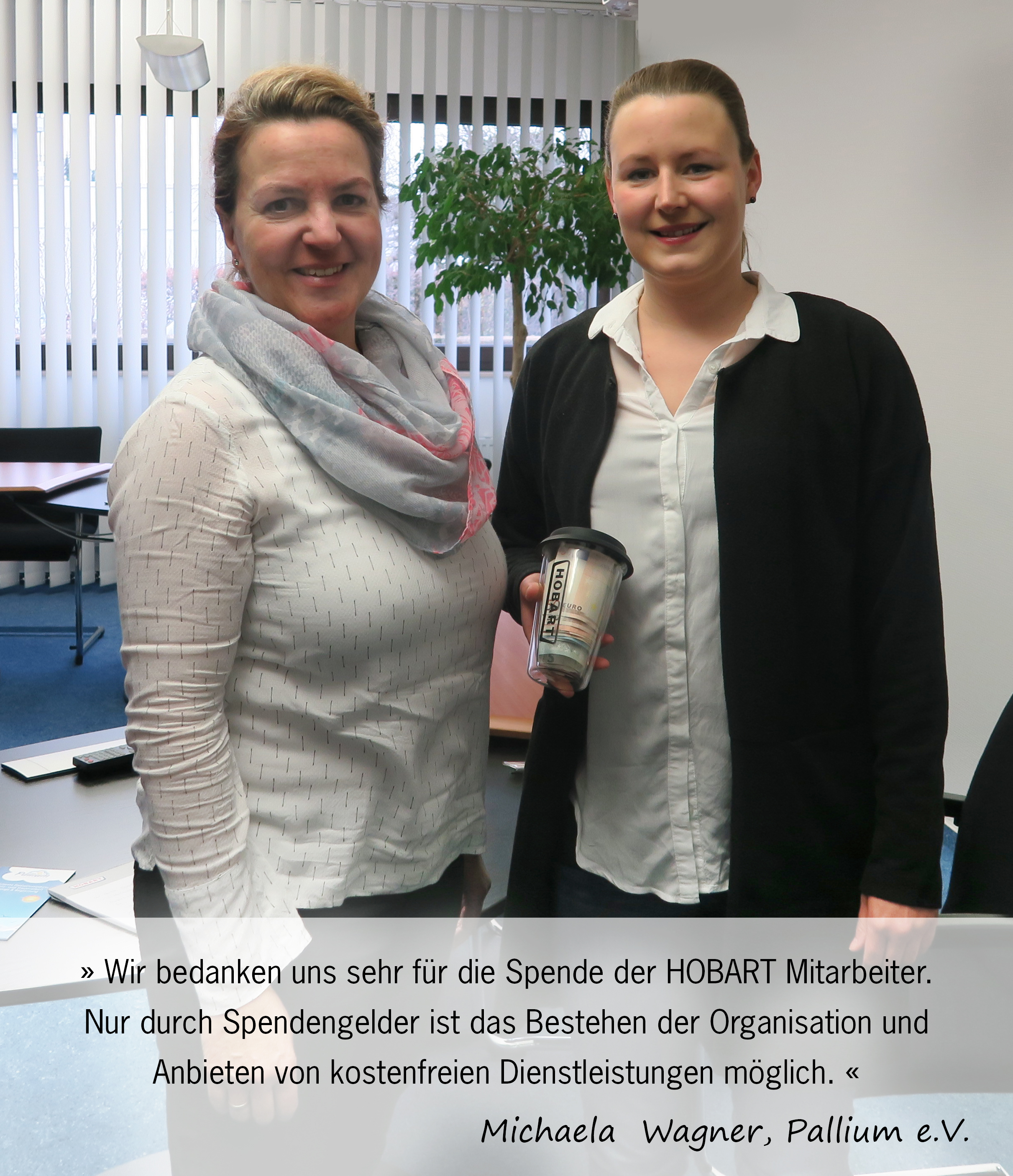 Michaela Wagner, gelernte Fachkrankenschwester für Intensiv- und Anästhesie, bei Pallium e.V. zuständig für Spenden, freute sich über diesen tollen Betrag. „Wir bedanken uns sehr für die Spende der HOBART Mitarbeiter. Nur durch Spendengelder ist das Bestehen der Organisation und Anbieten von kostenfreien Dienstleistungen möglich“ so Frau Wagner.