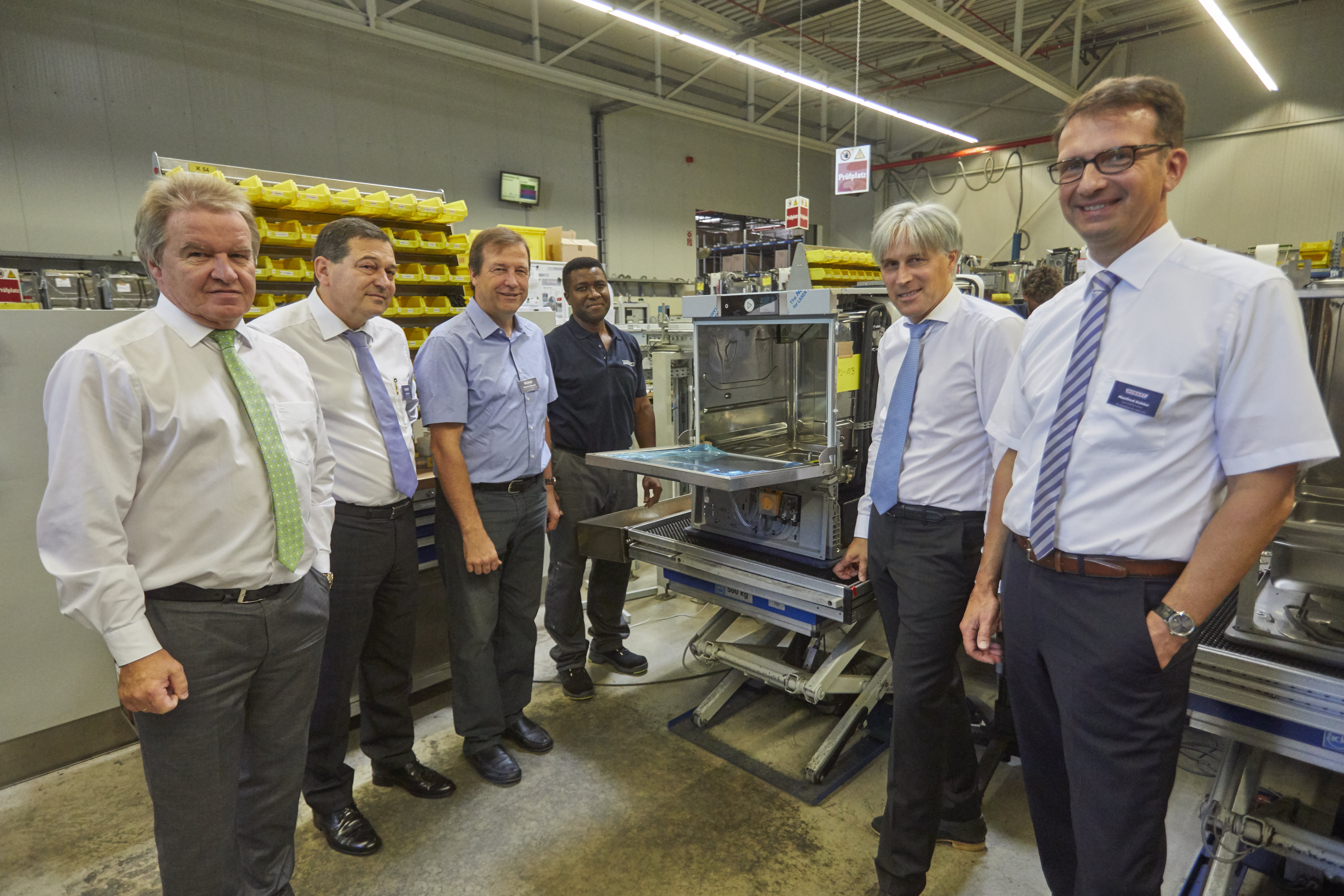Im zweiten Teil des Besuches, der Werksbesichtigung, folgte der Rundgang durch die Produktionshallen. Auf einer Fläche von derzeit 21.000 qm werden Spülmaschinen unterschiedlichster Größe, vom Untertischgerät im Haushalts-format bis zu großen Spülstraßen, gefertigt. Dazu kommen bis Ende 2020 weitere 13.000 qm hinzu.