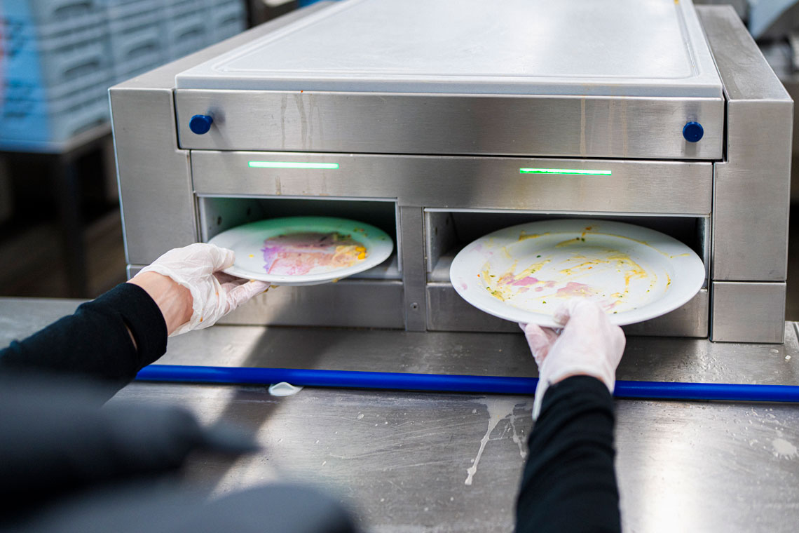 Die Handhabung ist denkbar einfach: Teller und Schalen werden in die speziell dafür vorgesehen Öffnungen eingelegt. Das Handling ist leicht und ergonomisch, da die Handbewegung auf einer Ebene erfolgt und kein Beugen, Bücken oder Drehen des Oberkörpers notwendig ist. Alle weiteren Schritte sind automatisiert. Die Teller und Schalen werden in die Maschine eingetaktet.