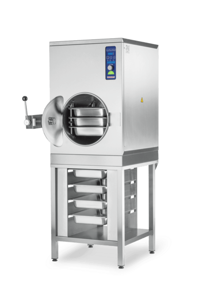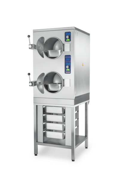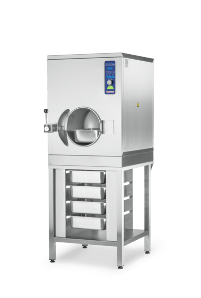 Garen Sie Ihre Produkte mit einem halben Bar Druck bei ca. 110 °C oder mit einem Bar bei ca. 120 °C in trockenem Dampf. Die Garzeiten sind dadurch mindestens viermal kürzer als bei einem Kombidämpfer. Fünf Kilo TK-Bohnen sind in zweieinhalb Minuten fertig; zwei Kilo Brokkoli nach 40 Sekunden gar – so schnell schafft das kein anderes Gerät.